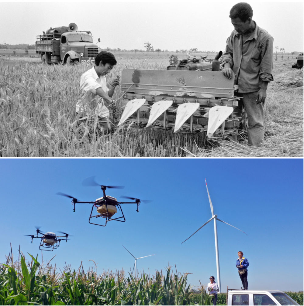 拼版照片:上圖為1986年,河南??h農(nóng)機公司組織服務隊走村串鄉(xiāng)義務修理農(nóng)業(yè)機械(新華社記者 唐茂林 攝);下圖為2020年9月4日,河南湯陰“精忠飛防大隊”飛手在操作植保無人機(新華社記者 李嘉南 攝)。