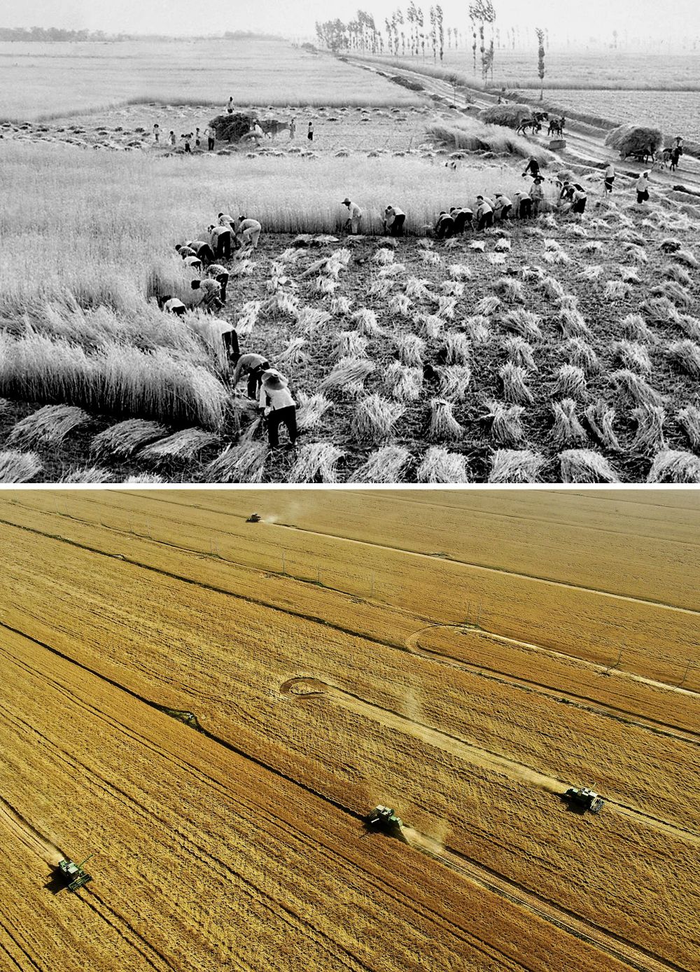 拼版照片:上圖為20世紀50年代,河南偃師萬畝豐產(chǎn)區(qū)開鐮收割小麥(新華社記者 唐茂林 攝);下圖為2021年6月6日,在河南周口黃泛區(qū)農(nóng)場九分場的麥田里,農(nóng)機手操作收割機收獲小麥(新華社記者 李安 攝)。
