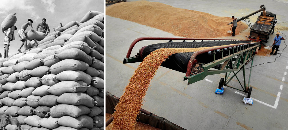 拼版照片:左圖為1959年,河南黃泛區(qū)農(nóng)場員工在堆放剛收打的小麥,準備入倉(新華社記者 楊震河 攝);右圖為2018年6月4日,在河南黃泛區(qū)農(nóng)場,工作人員將剛收打的小麥過篩后直接裝車,準備運往糧庫(新華社記者 李安 攝)。