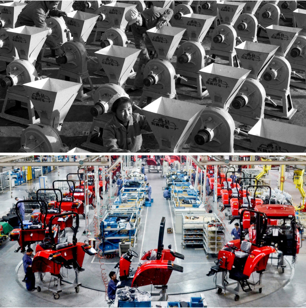 拼版照片:上圖為1971年,河南禹縣(現(xiàn)禹州市)生產(chǎn)的大批粉碎機準備運送出廠(蔡玉琦 攝);下圖為2012年9月12日拍攝的河南洛陽一拖集團東方紅拖拉機生產(chǎn)線(新華社發(fā))。
