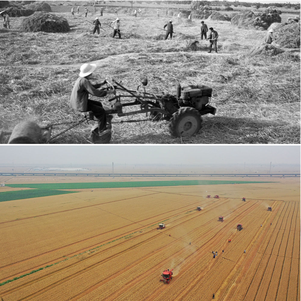 拼版照片:上圖為1982年,河南沈丘紙店公社紙店大隊13生產(chǎn)隊的社員用集體的手扶拖拉機碾打小麥(新華社記者 朱廣智 攝);下圖為2024年6月5日,河南省安陽市滑縣舉行小麥機收減損技能大比武活動,旨在規(guī)范節(jié)糧減損操作技能,減少糧食在收割環(huán)節(jié)的損失(新華社記者 郝源 攝)。