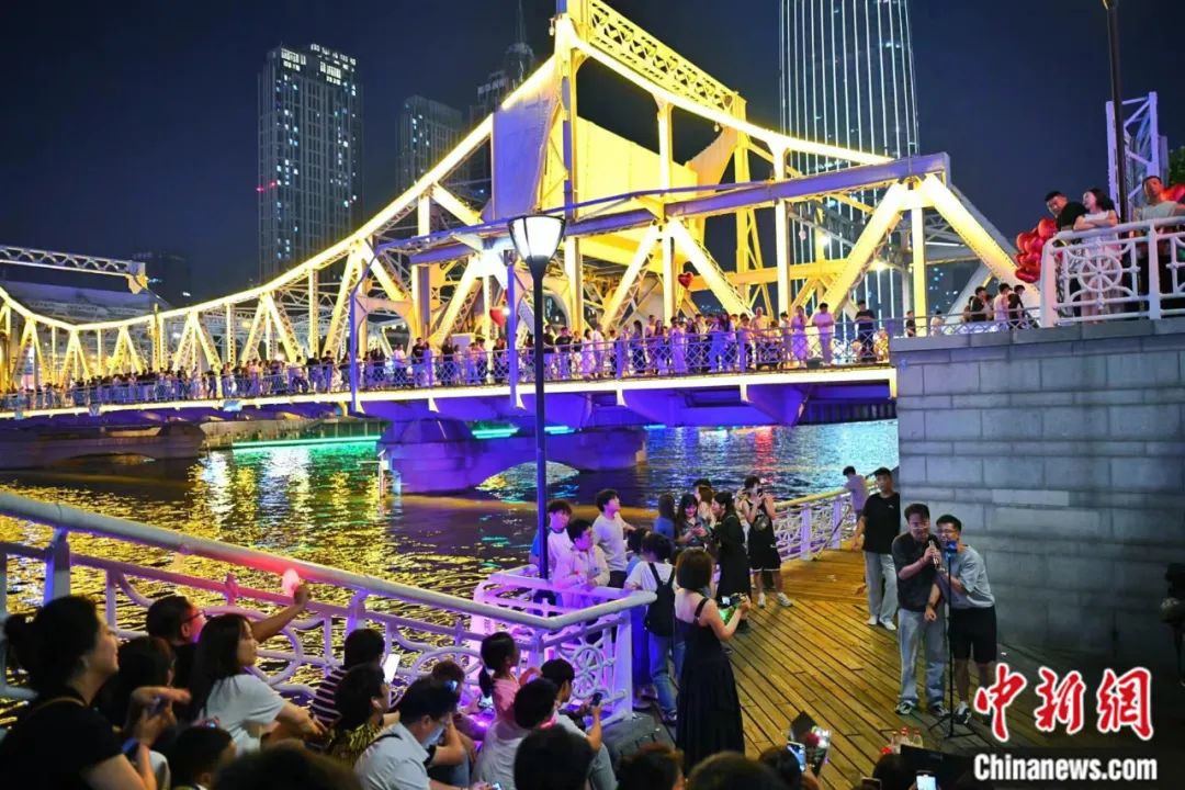 6月8日晚,在天津解放橋下的親水平臺,市民及游客近距離聆聽“野生歌手”的歌聲。中新社記者 佟郁 攝