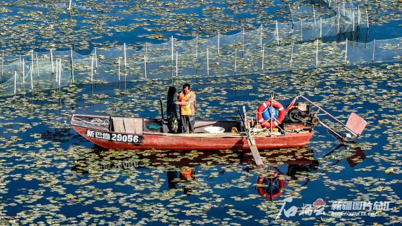 9月20日,養(yǎng)殖戶(hù)在博斯騰湖上捕撈螃蟹(無(wú)人機(jī)攝)。石榴云/新疆日?qǐng)?bào)記者 周鵬攝