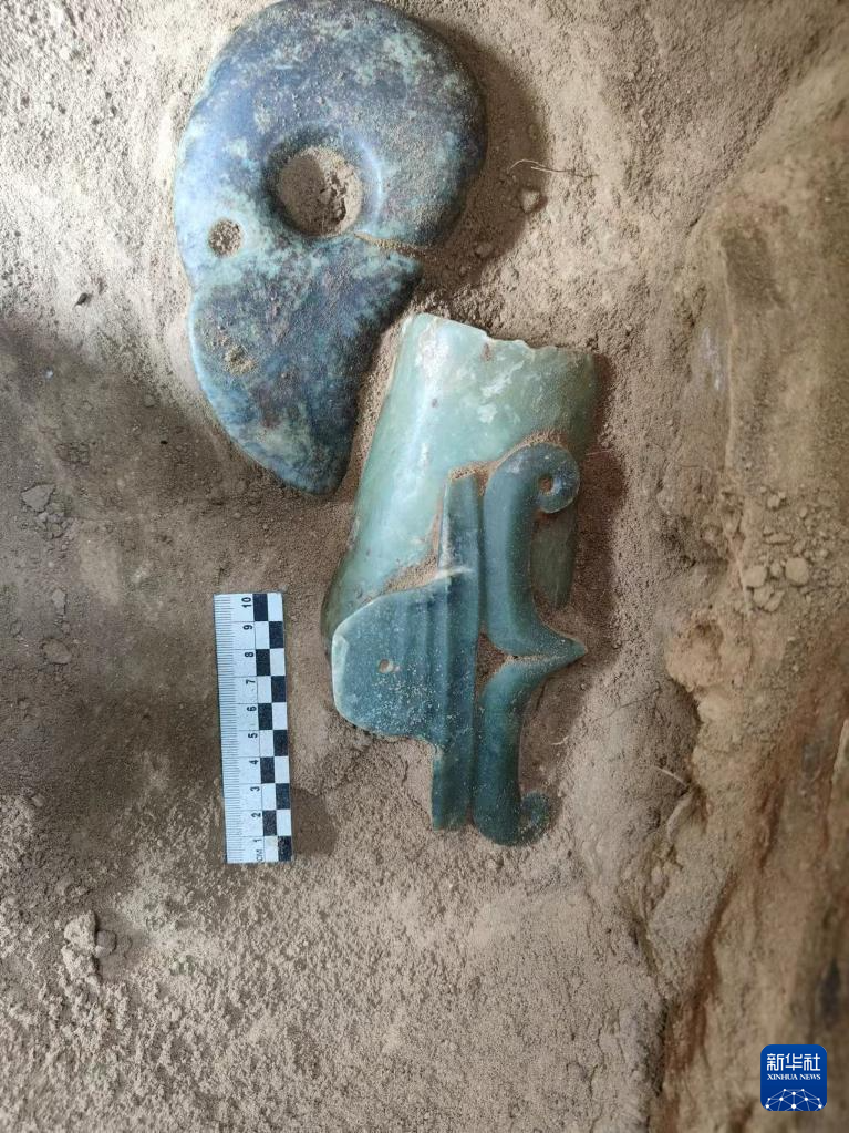 元寶山積石冢遺址隨葬玉器出土現(xiàn)場(chǎng)(資料照片)。新華社發(fā)