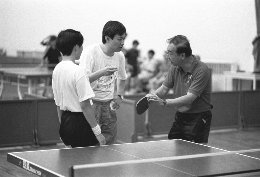 這是張燮林(右)在第35屆世界乒乓球錦標(biāo)賽女子雙打比賽中指導(dǎo)葛新愛(ài)、閻桂麗(資料照片)。新華社記者 胡偉 攝