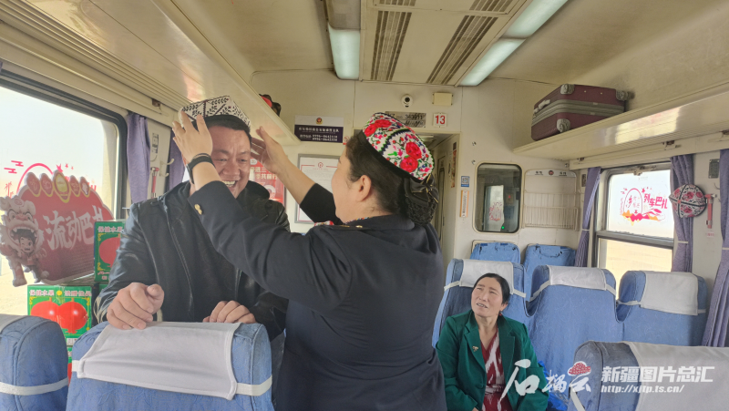 9月23日,7558次列車巴扎上,列車員瑪依然·賽買提給來新疆旅游的乘客戴上了一頂小花帽。石榴云/新疆日報(bào)記者 宋衛(wèi)國攝