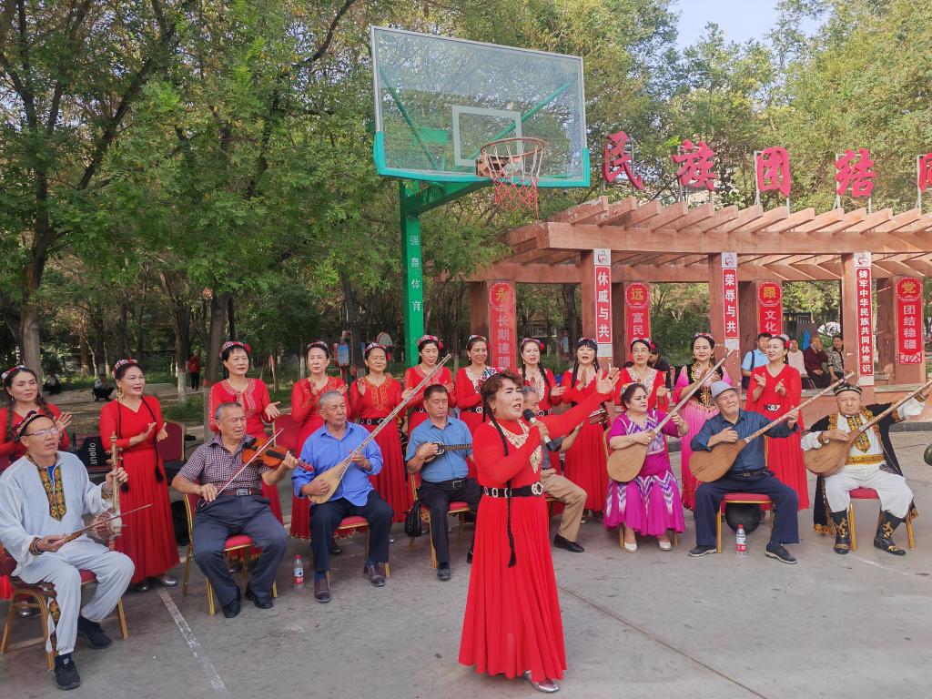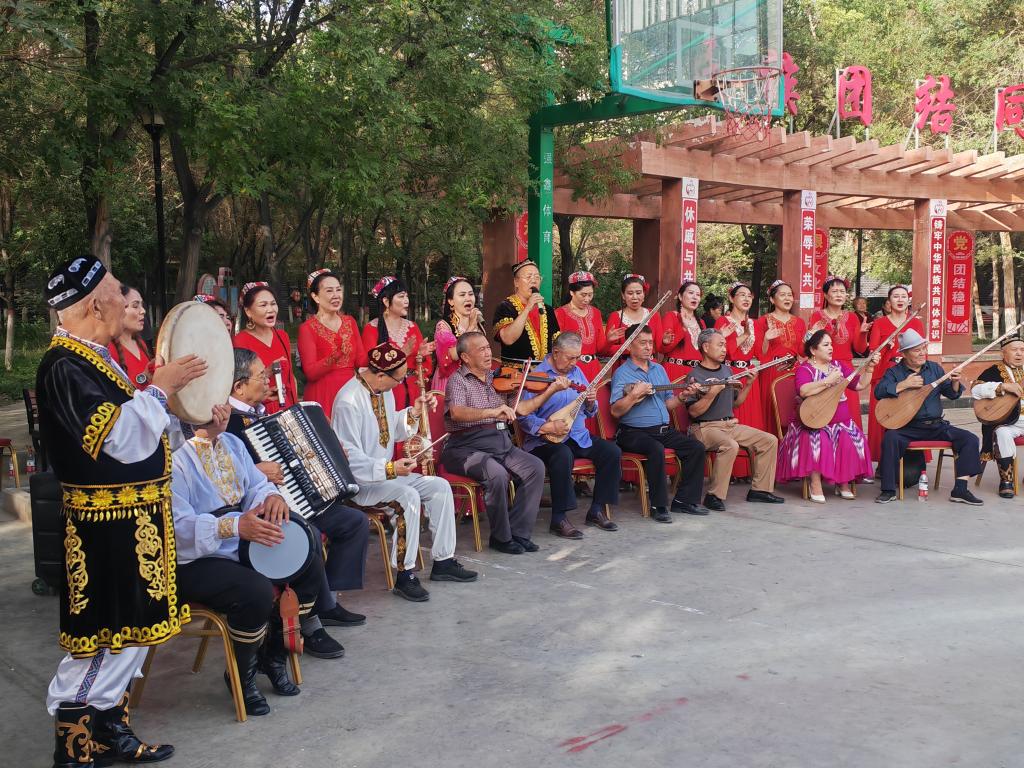 9月19日,庫爾勒市朝陽街道團結社區(qū)“石榴籽藝術團”正在為居民們表演。新華社記者顧煜 攝