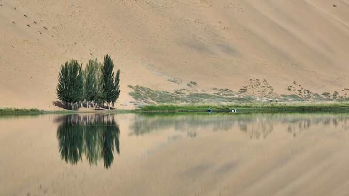 巴丹吉林沙漠的奇絕,還在其秀美的湖。144個大小湖泊形狀、顏色各異。沙漠中最大最深的湖泊諾日圖湖,水域面積約147平方公頃,最大水深約26米。由于礦物質和鹵蟲等生物含量不同,不少湖泊在陽光照耀下呈現(xiàn)不同色彩,有四季深淺不一的紅色和紫色,甚至還有雙色。巴丹湖是沙漠中為數(shù)不多的淡水湖,細看水中還有魚類游動。音德日圖湖的湖心小島上,涌出百余個泉眼,泉水涓淌不止,蔚為壯觀。