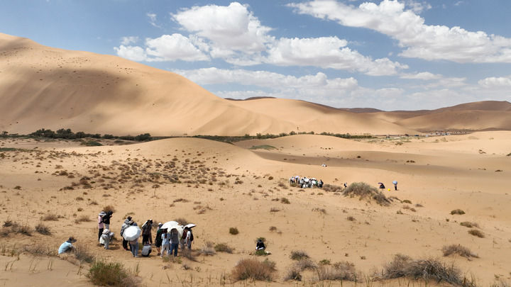 2024年7月31日,來自蘭州大學、香港浸會大學、西南大學等18所高校的100余位師生在巴丹吉林沙漠開展“發(fā)現(xiàn)計劃”地理學聯(lián)合實習,這是部分師生在巴丹吉林沙漠中開展植被樣方調查(無人機照片)。