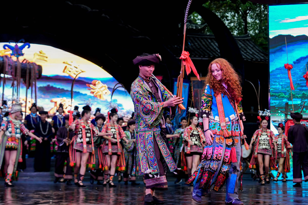 9月16日,美國(guó)青年學(xué)生在貴州省西江千戶苗寨體驗(yàn)民族歌舞。(圖片來(lái)源:新華社)