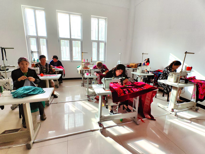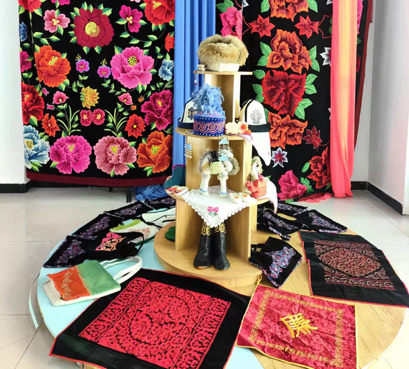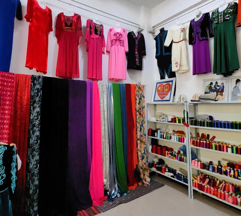 托云牧場積極鞏固政策支持,集中力量打造項(xiàng)目驅(qū)動(dòng),有效推進(jìn)地方產(chǎn)業(yè)集群的全面發(fā)展,實(shí)現(xiàn)經(jīng)營集約化與產(chǎn)業(yè)高效整合。2015年,由牧場“刺繡巧匠”吐孔·沙熱牽頭并成功注冊了“托云牧場帕米爾刺繡”合作社。到了2019年,牧場成功申請到160萬元援疆資金,用于建設(shè)新的手工刺繡產(chǎn)品生產(chǎn)基地。在吐孔·沙熱的帶動(dòng)下,合作社目前擁有60名成員,其中43名技藝嫻熟的繡工,年總收入攀升至三十萬。該合作社通過直銷、與克州百來思服裝店的業(yè)務(wù)合作,以及接受附近學(xué)校的校服訂單等多種渠道,將其生產(chǎn)的床品、家居布藝、女性服裝及校服推向阿圖什市、烏恰縣等地區(qū)市場。