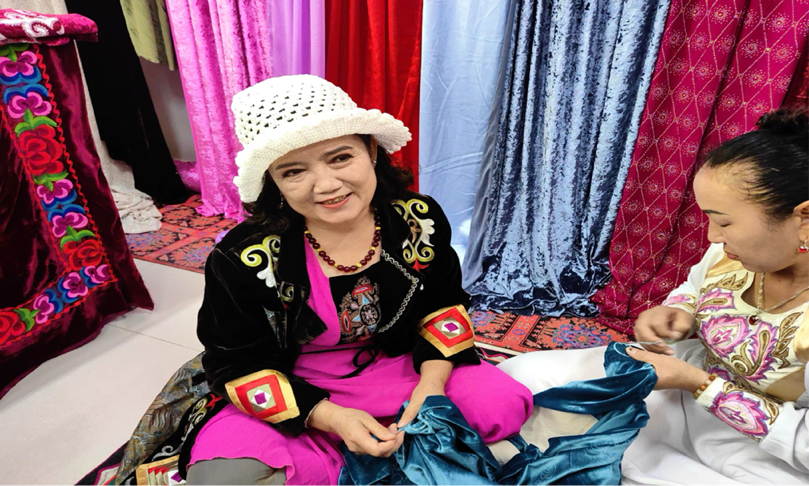 將傳統(tǒng)手工藝轉(zhuǎn)化為商品,市場化推進(jìn),托云牧場不懈探索手工藝與鄉(xiāng)村振興的新路徑,助力當(dāng)?shù)厥止に嚾藢ⅰ爸讣饧妓嚒鞭D(zhuǎn)化為“指尖經(jīng)濟(jì)”。維吾爾族姑娘努力曼古麗·買加買提分享道:“在刺繡合作社,我與柯爾克孜族的姐妹互相切磋學(xué)習(xí),通過刺繡工藝的差異,我們發(fā)現(xiàn)了各民族刺繡的獨(dú)特風(fēng)格,同時(shí)發(fā)現(xiàn)很多共通的地方。在彼此互相了解學(xué)習(xí)的過程中,感受到了各民族文化的相互交融與共同進(jìn)步?!?/p>