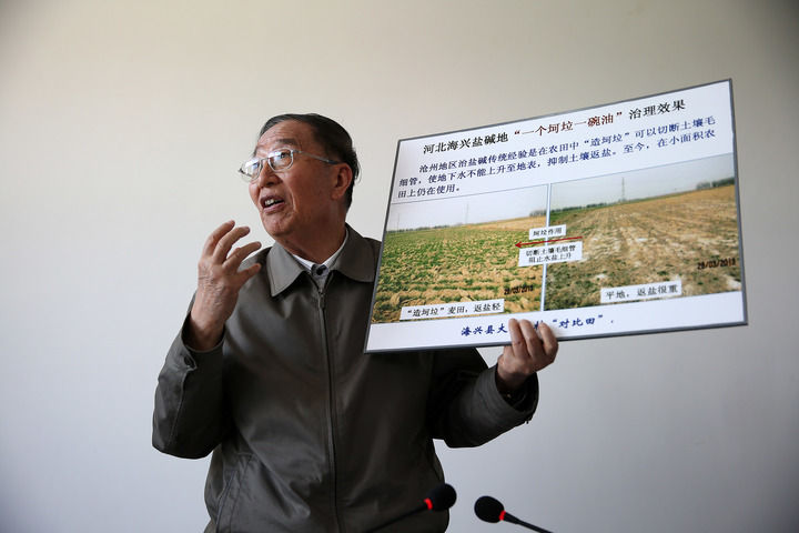 李振聲院士在介紹河北海興鹽堿地治理的前后對比照片(2014年5月5日攝)。新華社記者 金立旺 攝