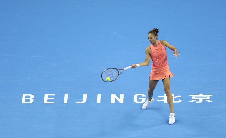 10月2日,鄭欽文在比賽中回球。當(dāng)日,在北京進(jìn)行的2024中國網(wǎng)球公開賽女子單打第四輪比賽中,中國選手鄭欽文2比1戰(zhàn)勝美國選手阿尼西莫娃,晉級八強。新華社發(fā)(杜昕怡攝)