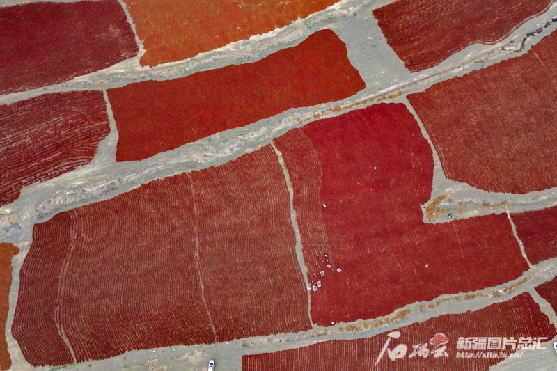 10月3日,種植戶在沙灣市安集海鎮(zhèn)萬畝天然曬場翻曬辣椒(無人機(jī)攝)。