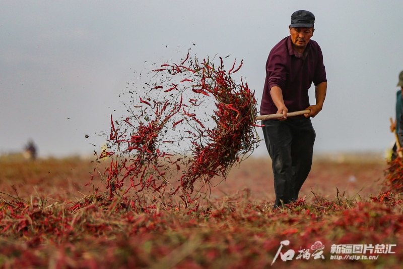 10月3日,種植戶在沙灣市安集海鎮(zhèn)萬畝天然曬場翻曬辣椒。