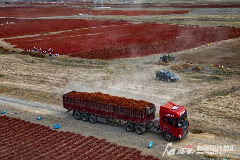 10月3日,貨運汽車在沙灣市安集海鎮(zhèn)萬畝天然曬場轉(zhuǎn)運辣椒(無人機(jī)攝)。