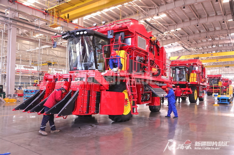 2024年3月12日,工人在位于五家渠市的新疆天鵝現(xiàn)代農(nóng)業(yè)機(jī)械裝備有限公司采棉機(jī)生產(chǎn)線上生產(chǎn)采棉機(jī)。李華北攝