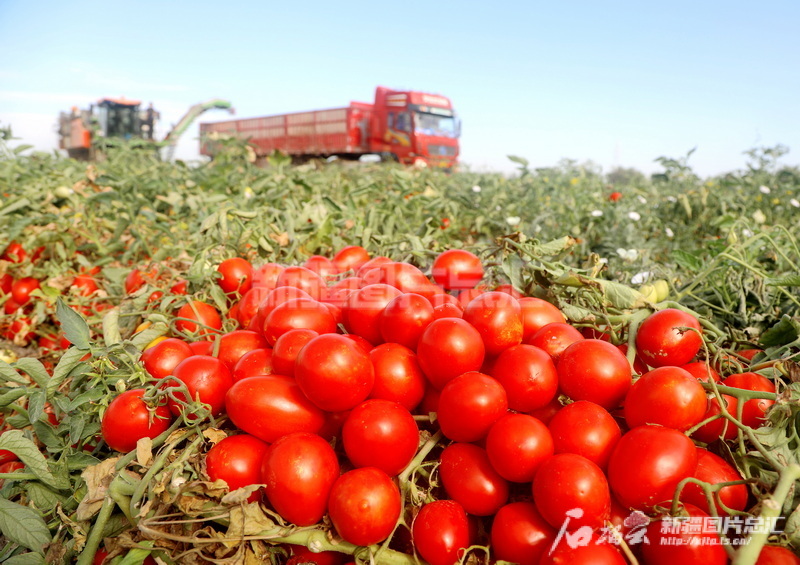 2024年8月15日,在新疆生產(chǎn)建設(shè)兵團(tuán)第六師101團(tuán)一塊農(nóng)田里,職工采用機(jī)械收獲加工番茄。魏新江攝