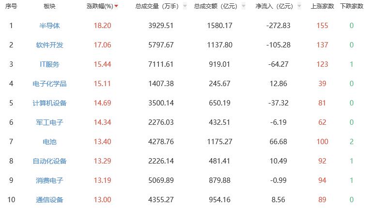 板塊方面,半導(dǎo)體、軟件開發(fā)、IT服務(wù)、電子化學(xué)品、計算機(jī)設(shè)備等漲幅居前。