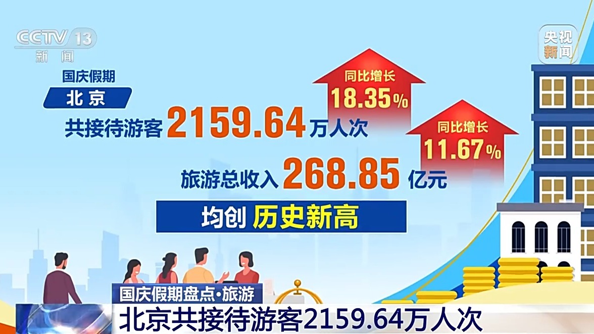 統(tǒng)計(jì)數(shù)據(jù)顯示,國慶假期,北京共接待游客2159.64萬人次,同比增長18.35%;旅游總收入268.85億元,同比增長11.67%,均創(chuàng)歷史新高。文博游、北京中軸線游、京郊游、微度假游、體育賽事游、特色商圈文化街區(qū)游、花燈游、網(wǎng)紅潮玩打卡地游等受到游客青睞。
