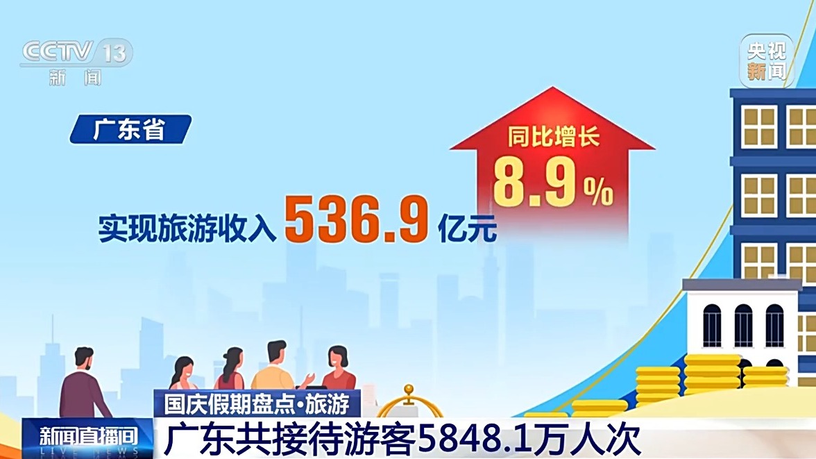 廣東省10月1日至7日累計(jì)接待游客5848.1萬人次,按可比口徑同比增長6.2%;實(shí)現(xiàn)旅游收入536.9億元,同比增長8.9%。古驛道沿線重點(diǎn)區(qū)域、紅色旅游經(jīng)典景區(qū)、鄉(xiāng)村旅游點(diǎn)和歷史古村落等,成為旅游出行熱點(diǎn)。
