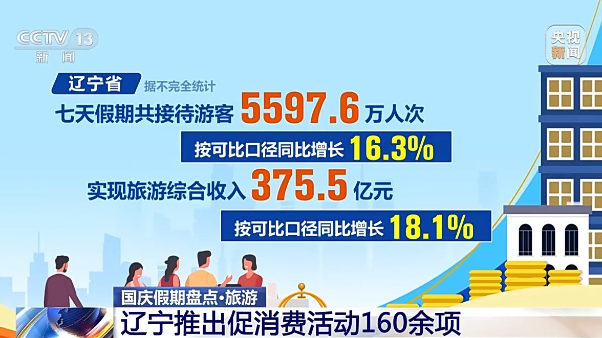 遼寧省據(jù)不完全統(tǒng)計(jì),七天假期共接待游客5597.6萬人次,按可比口徑同比增長16.3%,實(shí)現(xiàn)旅游綜合收入375.5億元,按可比口徑同比增長18.1%。假期里遼寧省推出促消費(fèi)活動(dòng)160余項(xiàng),全省各地舉辦文化藝術(shù)、群眾文化、非遺、文博等各類活動(dòng)600余場,通過線上線下聯(lián)動(dòng)的方式,豐富人們假日文化生活。