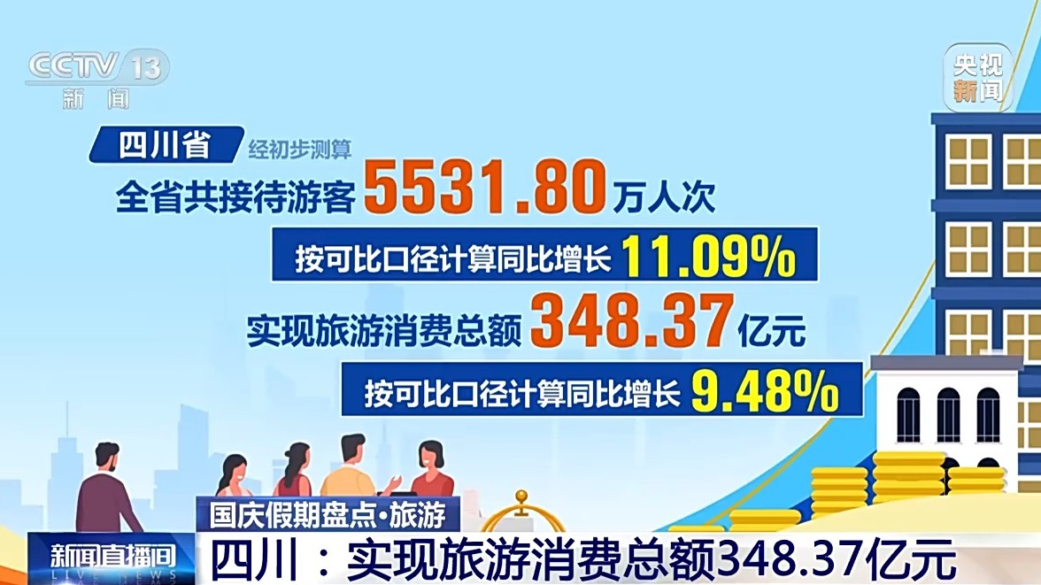 四川省經(jīng)初步測算,全省共接待游客5531.80萬人次,實(shí)現(xiàn)旅游消費(fèi)總額348.37億元,按可比口徑計(jì)算,同比分別增長11.09%和9.48%。全省核心旅游景區(qū)“狀態(tài)拉滿”,17家5A級(jí)景區(qū)累計(jì)接待游客426.93萬人次、實(shí)現(xiàn)門票收入1.85億元,同比分別增長25.06%和15.48%,超越假日歷史最高水平。九寨溝景區(qū)連續(xù)4天均達(dá)4.1萬人承載量上限。