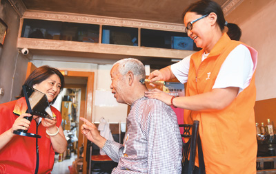 河南省洛陽市澗西區(qū)積極構(gòu)建“嵌入式”養(yǎng)老服務(wù)體系,為老年人提供養(yǎng)老助餐、社區(qū)娛樂、健康管理、上門保潔等綜合養(yǎng)老服務(wù)項目,讓老人在家門口享受全方位養(yǎng)老。圖為澗西區(qū)武漢路街道秦嶺路社區(qū),養(yǎng)老服務(wù)中心護(hù)理員和社區(qū)志愿者為居家老人理發(fā)。黃政偉攝(人民視覺)