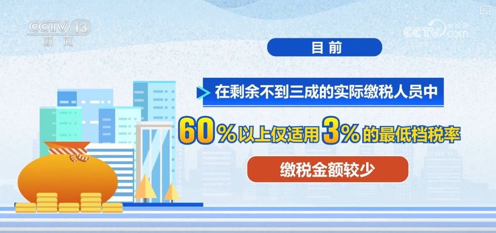 國家稅務(wù)總局稅收數(shù)據(jù)顯示,目前,我國取得綜合所得的人員中,無需繳納個稅的人員占比超過七成,在剩余不到三成的實(shí)際繳稅人員中,60%以上僅適用3%的最低檔稅率,繳稅金額較少。