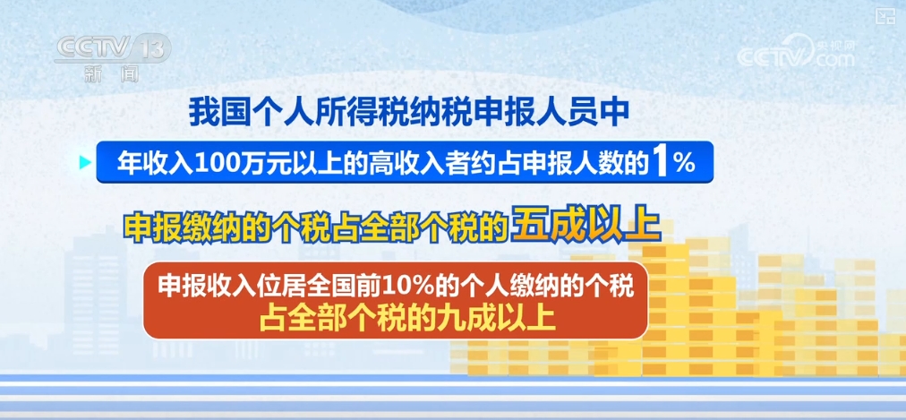 數(shù)據(jù)顯示,我國個人所得稅納稅申報人員中,年收入100萬元以上的高收入者約占申報人數(shù)的1%,但這部分人申報繳納的個稅占全部個稅的五成以上,申報收入位居全國前10%的個人繳納的個稅占全部個稅的九成以上。