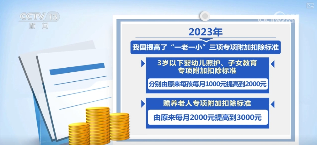 據(jù)介紹,2023年,我國提高了“一老一小”三項(xiàng)專項(xiàng)附加扣除標(biāo)準(zhǔn)。3歲以下嬰幼兒照護(hù)、子女教育專項(xiàng)附加扣除標(biāo)準(zhǔn),分別由原來每孩每月1000元提高到2000元,贍養(yǎng)老人專項(xiàng)附加扣除標(biāo)準(zhǔn)由原來每月2000元提高到3000元。