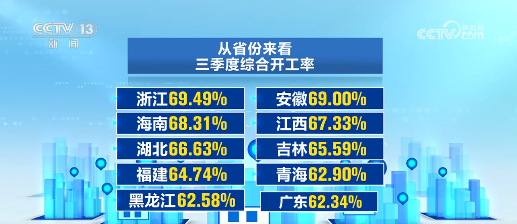 從省份來(lái)看,三季度綜合開(kāi)工率排名前十的有浙江、安徽、海南等,且開(kāi)工率都在60%以上,工程建設(shè)熱情高漲。