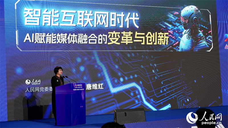 人民網(wǎng)監(jiān)事會(huì)主席、研究院院長(zhǎng)唐維紅發(fā)表題為《智能互聯(lián)網(wǎng)時(shí)代AI賦能媒體融合的變革與創(chuàng)新》的主題報(bào)告。人民網(wǎng)記者 吳茜薇攝