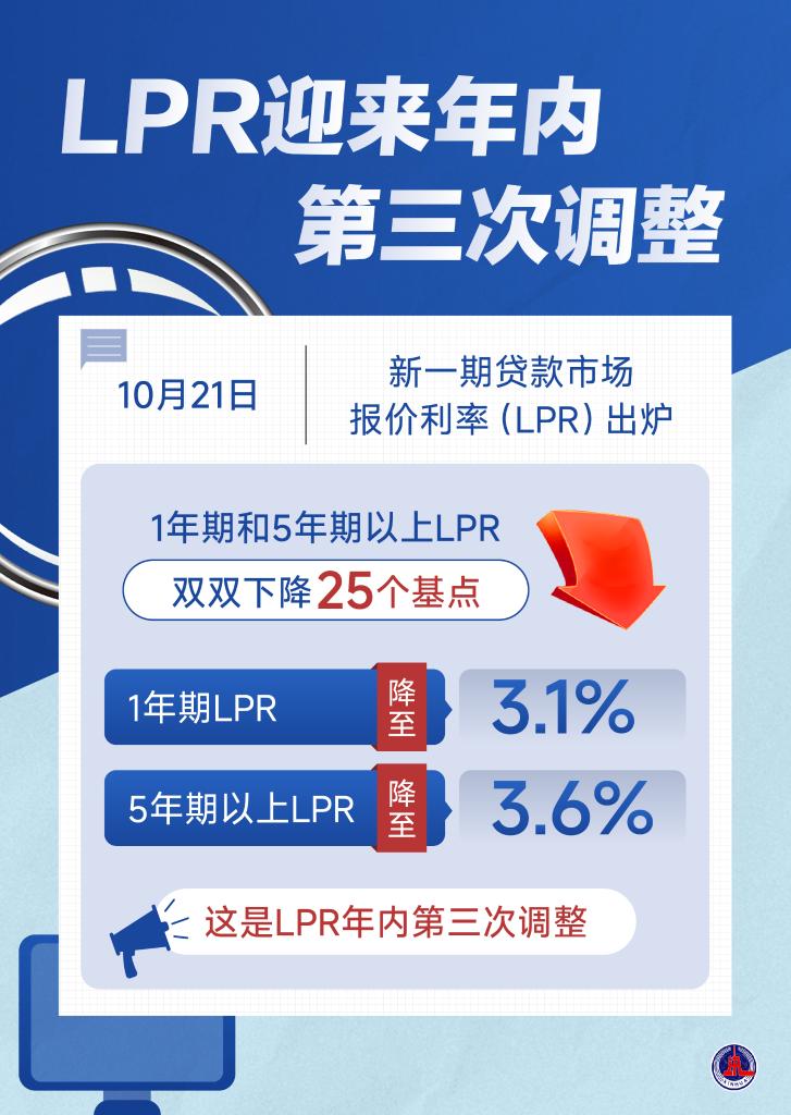 10月21日,新一期貸款市場報(bào)價(jià)利率(LPR)發(fā)布,1年期和5年期以上LPR雙雙下降25個基點(diǎn),1年期LPR降至3.1%,5年期以上LPR降至3.6%。