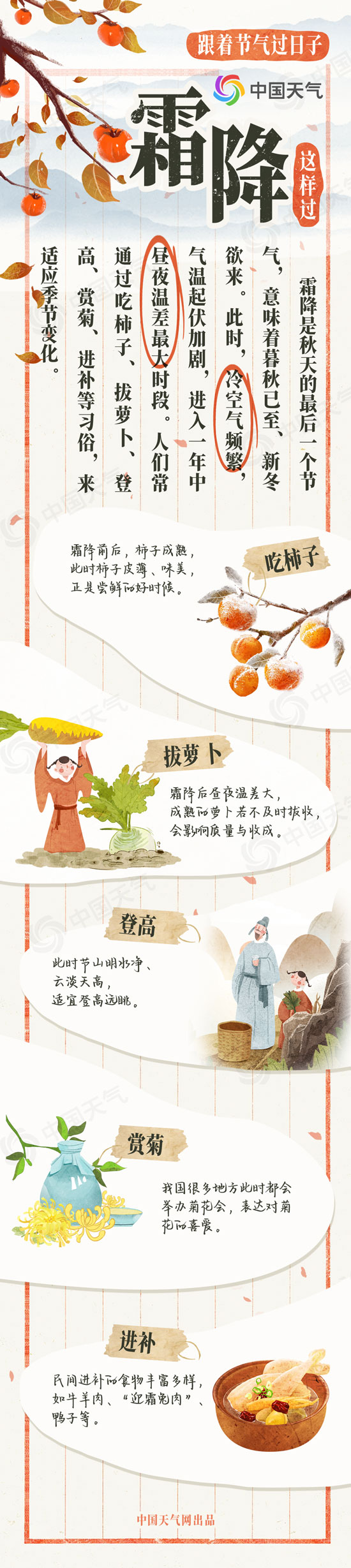 春生夏長,秋收冬藏,跟著節(jié)氣過日子。今天(10月23日)進(jìn)入秋天的最后一個節(jié)氣——霜降,意味著暮秋已至、新冬欲來。此時,冷空氣頻繁,氣溫起伏加劇,進(jìn)入一年中晝夜溫差最大時段。人們常通過吃柿子、拔蘿卜、登高、賞菊、進(jìn)補等習(xí)俗,來適應(yīng)季節(jié)變化。中國天氣網(wǎng)特別推出霜降風(fēng)俗圖鑒和霜降全國天氣地圖,看看這個節(jié)氣怎么過。