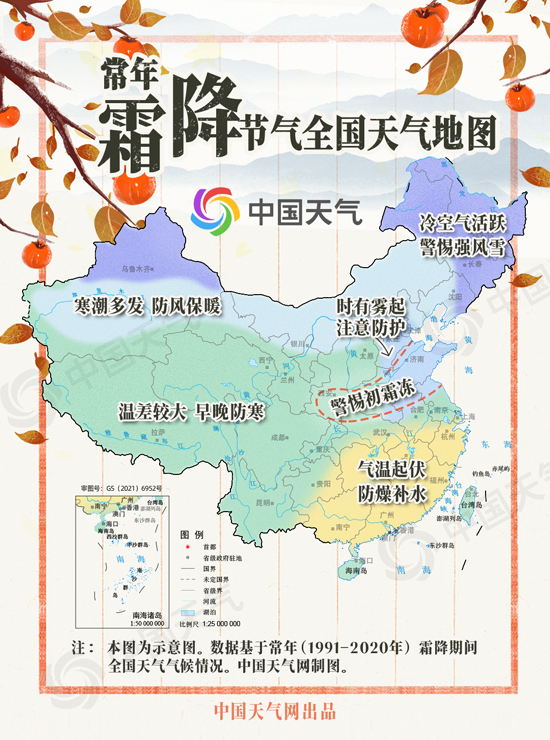“霜降三旬后,蓂馀一葉秋?!背D晁倒?jié)氣期間,影響我國的冷空氣越來越頻繁,多地天氣由涼轉(zhuǎn)寒,晝夜溫差增大。隨著氣溫走低,冬季的地盤也開始擴(kuò)張,內(nèi)蒙古、東北大部、山西、河北北部等地往往在霜降時節(jié)步入冬季,秋天最前沿會抵達(dá)江南南部地區(qū)。