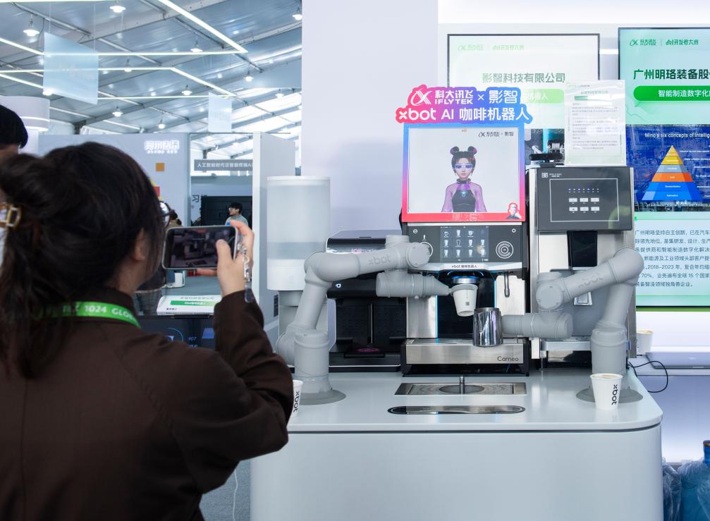 在第七屆世界聲博會上展出的AI咖啡機器人。新華社記者 傅天 攝