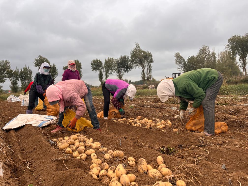 在甘肅省張掖市山丹縣甘農(nóng)薯7號(hào)綠色標(biāo)準(zhǔn)化連片示范基地里,村民正在撿收馬鈴薯。(受訪者供圖)
