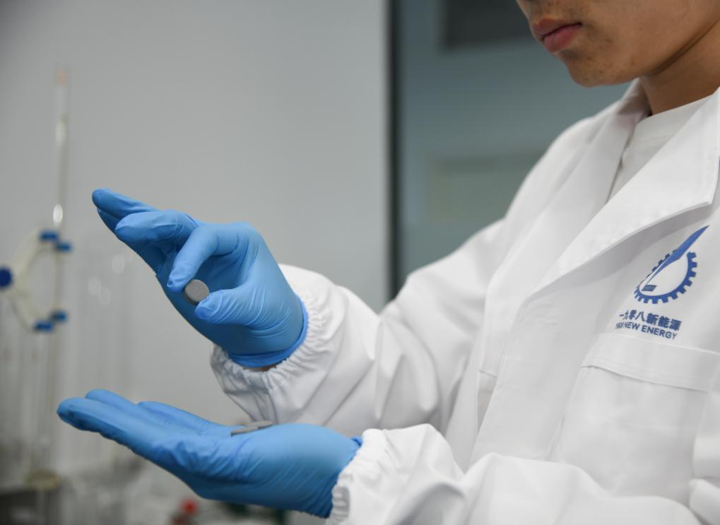 西安一九零八新能源科技有限公司科研人員在展示由其研發(fā)的復(fù)雜金屬基復(fù)合固態(tài)儲(chǔ)氫材料。新華社記者 張博文 攝
