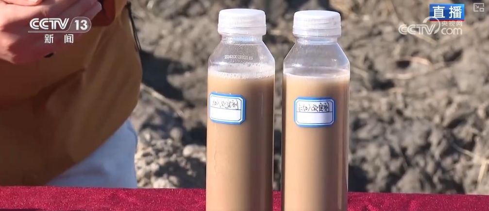 這片田采用的是有機(jī)硅改良劑來治理的鹽堿地,選取同地塊的鹽堿土溶于水中,加入有機(jī)硅后,土壤和水快速分層。可以看到,有機(jī)硅具有較強(qiáng)的親土性,可以和土壤包裹一起,阻斷鹽分吸收,從而達(dá)到降堿和改變土壤板結(jié)的作用。這能讓水稻更好地扎根生長,渾濁的水變清澈,也可以增加作物的光合作用,有效治理重度鹽堿土壤。