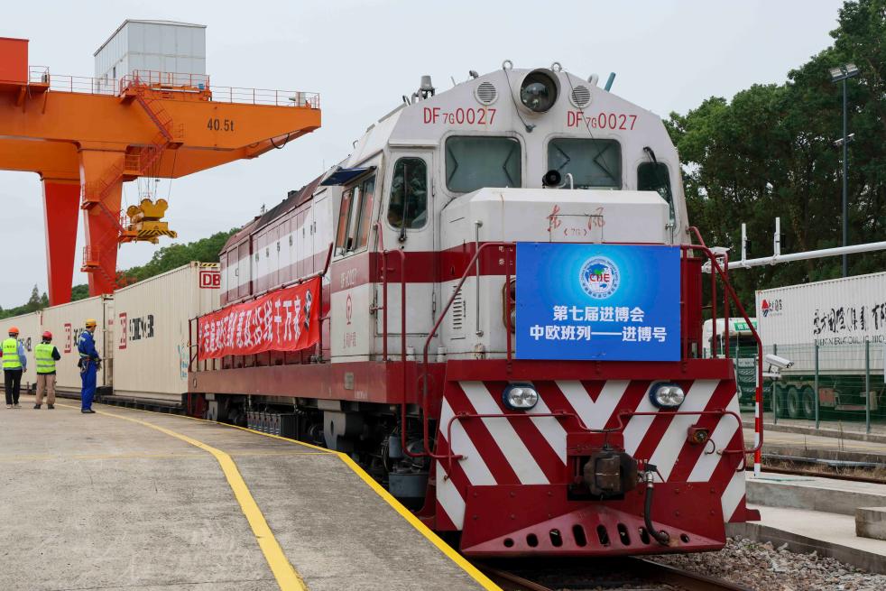 10月20日,首趟“中歐班列——進(jìn)博號”抵達(dá)上海鐵路物流中心閔行貨場中儲專用線。新華社記者王翔 攝