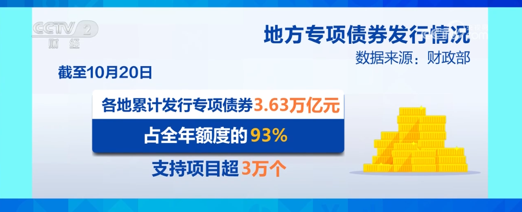 數(shù)據(jù)顯示,9月份,全國一般公共預(yù)算支出、政府性基金預(yù)算支出同比分別增長5.2%和34.2%。同時(shí),地方專項(xiàng)債券發(fā)行加速,9月發(fā)行約占全年額度的26%。截至10月20日,各地累計(jì)發(fā)行專項(xiàng)債券3.63萬億元,占全年額度的93%,支持項(xiàng)目超3萬個(gè)。
