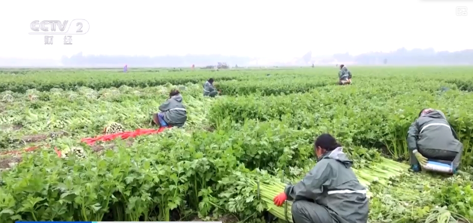在山東德州齊河縣后王村,清新翠綠的芹菜挺拔脆嫩,種植戶正忙著收割、分揀、打捆、裝車。