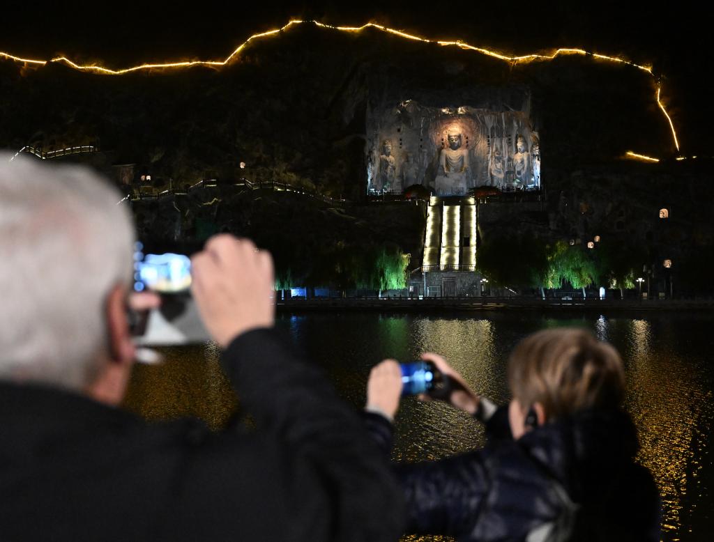11月4日,外賓在河南省洛陽(yáng)市龍門石窟景區(qū)禮佛臺(tái)拍照留念。新華社記者 李嘉南 攝