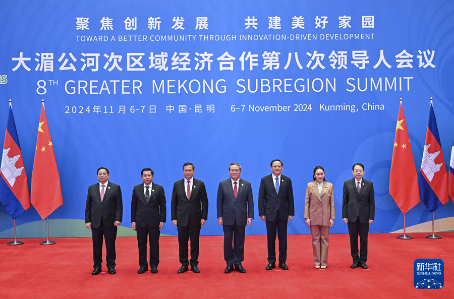 11月7日,國務(wù)院總理李強(qiáng)在昆明出席大湄公河次區(qū)域經(jīng)濟(jì)合作第八次領(lǐng)導(dǎo)人會(huì)議。這是李強(qiáng)同出席會(huì)議的柬埔寨、老撾、緬甸、泰國、越南政府首腦和亞洲開發(fā)銀行行長合影。新華社記者 殷博古 攝