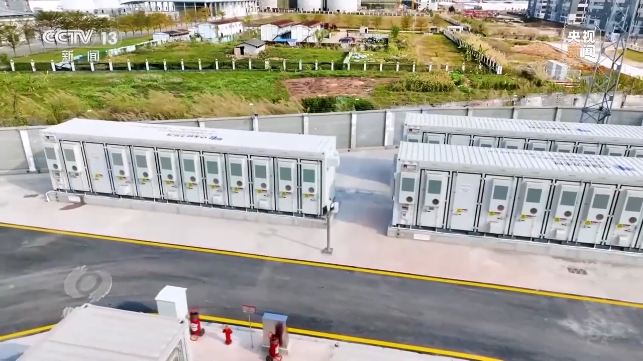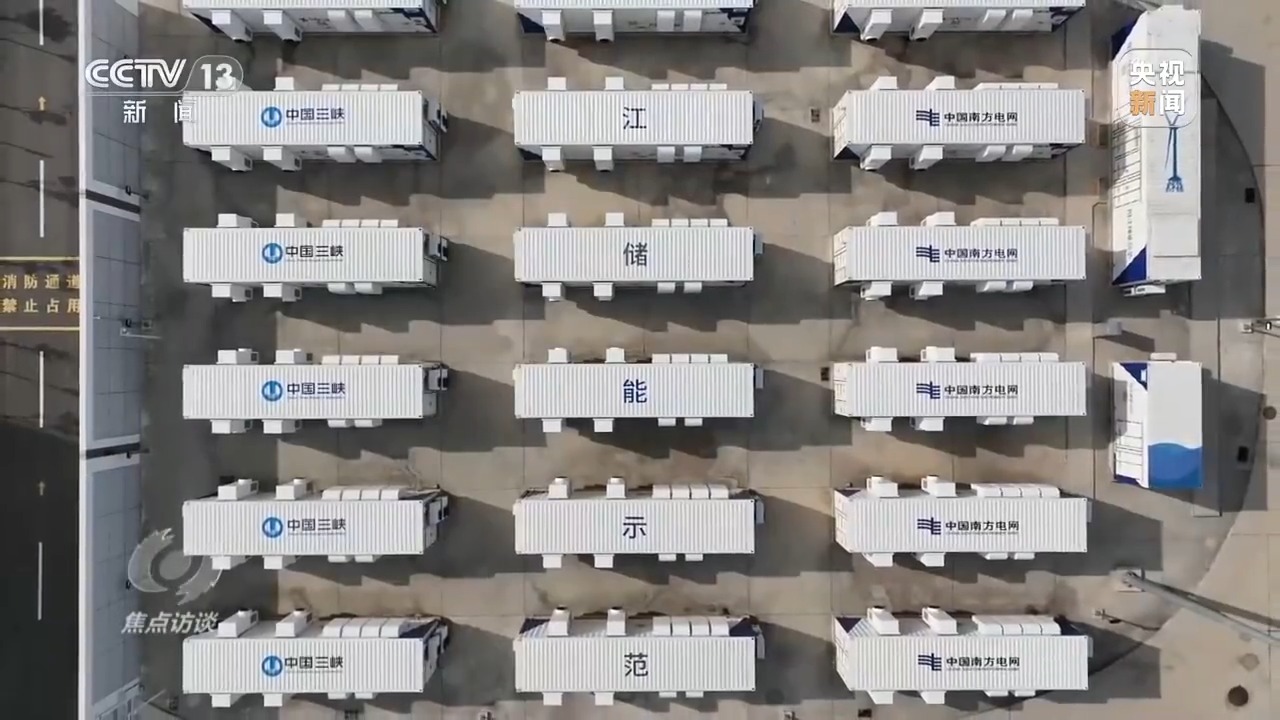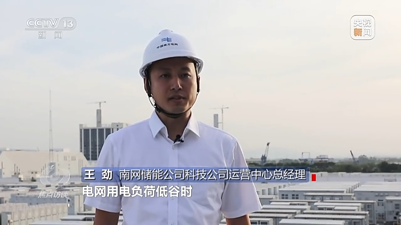 南網(wǎng)儲能公司科技公司運營中心總經(jīng)理 王勁:電網(wǎng)用電負(fù)荷低谷時,把電廠發(fā)出的多余的電儲存到250個電池儲能柜內(nèi),用電高峰時,把電池儲能柜里的電能釋放出來支持電網(wǎng)的電力供應(yīng)。