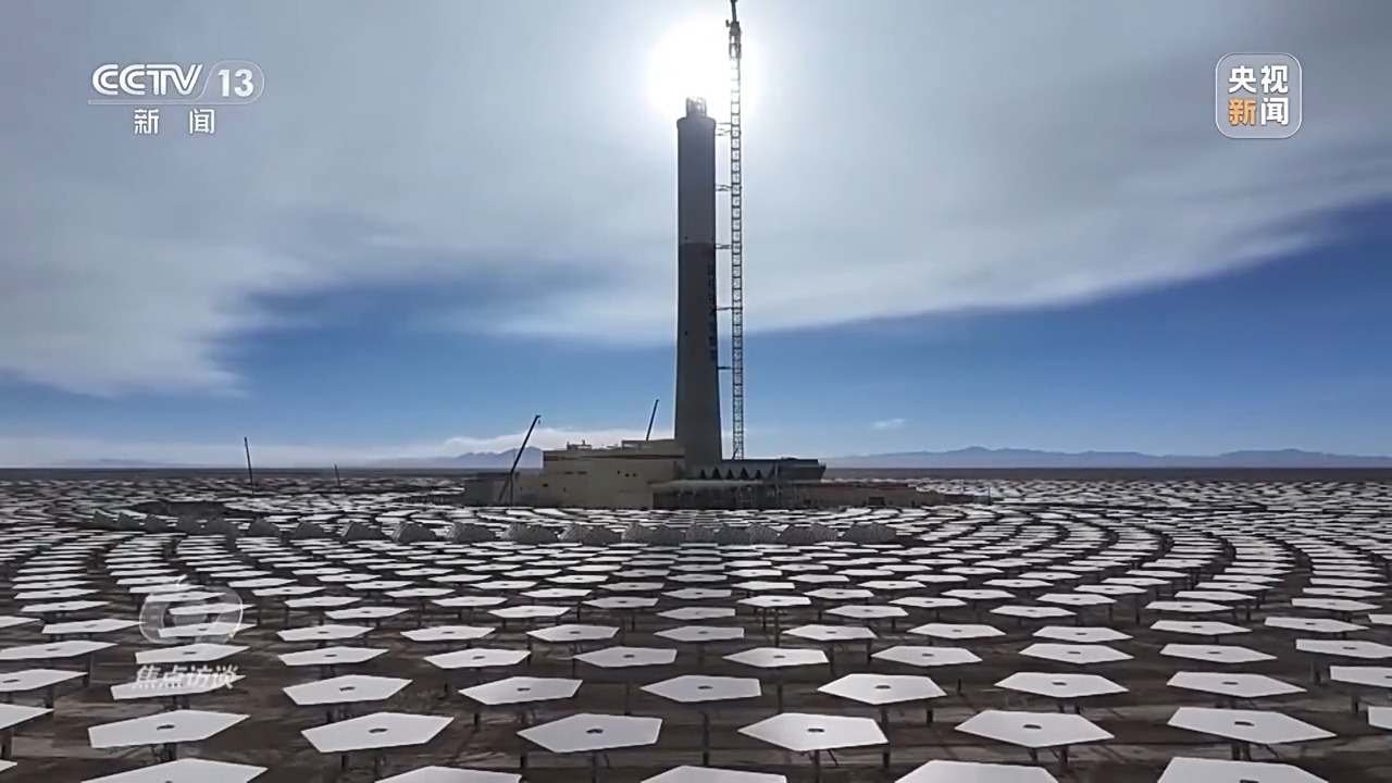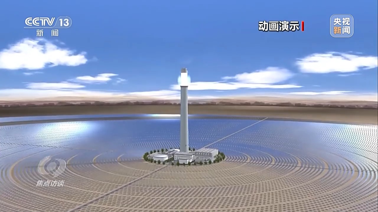 電站通過高精度智能定日鏡,實時跟蹤太陽的運動,將太陽直接輻射光反射聚集到吸熱塔上,將吸熱塔內(nèi)的熔鹽加熱到560多℃的高溫,將高溫的熔鹽進(jìn)行儲存,在需要發(fā)電時再通過高溫熔鹽與水進(jìn)行熱交換,產(chǎn)生高溫高壓的蒸汽,驅(qū)動汽輪發(fā)電機組發(fā)電。
