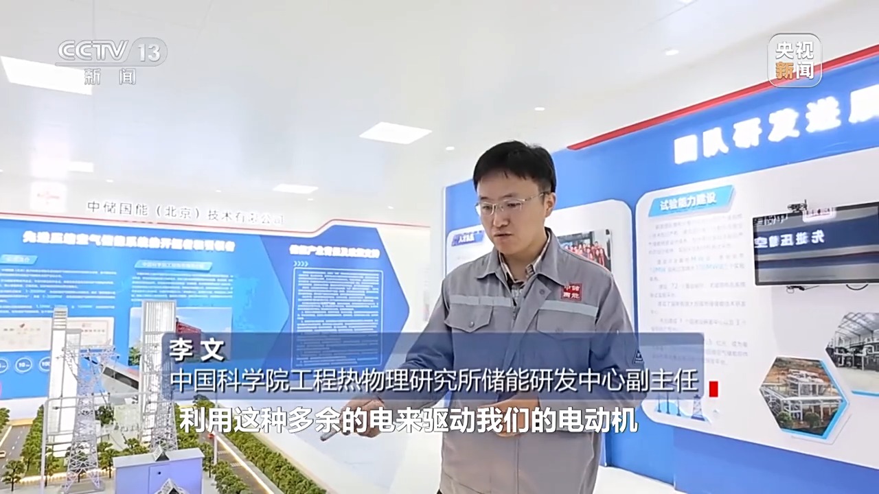 中國科學(xué)院工程熱物理研究所儲能研發(fā)中心副主任 李文:利用多余的電來驅(qū)動電動機,帶動壓縮機把空氣壓縮到高壓狀態(tài),最后存儲到儲氣裝置中,在有需要的時候,我們利用所存儲的高壓空氣來驅(qū)動膨脹機,帶動發(fā)電機進(jìn)行做功發(fā)電。