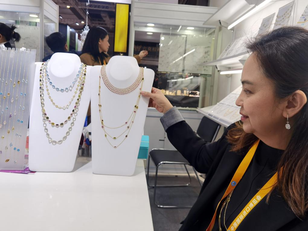 11月7日,首次參展進(jìn)博會(huì)的阿拉尼婭在介紹展位上的珠寶首飾。 新華社記者 許曉青 攝